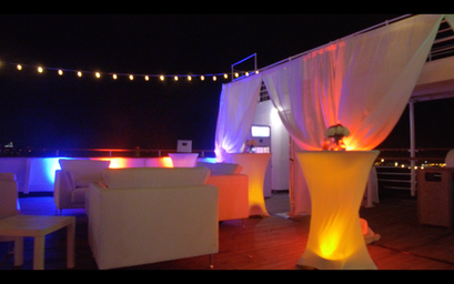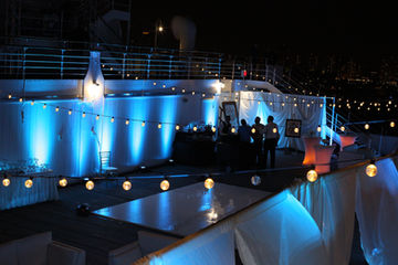 Cafe string lights add an elegant look to any event. We run lights from the top of the ship to towers we bring on the ship.